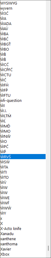 W, Ŵ, Ẁ, Ẃ, Ẅ, Ẇ, Ẉ, ᴡ, 𝗪, 𝘞, 𝙒, 𝚆, 𝚿, 𝛹, 𝜳, 𝝭, 𝞧, 𝑊, 𝑾, 𝒲, 𝒲, 𝔚, 𝕎, 𝖂, 𝖶