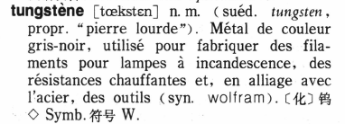 tungsten是不大可能开始发 tœ 这个音的,去查了下法文版,注音为 [tœ̃kstɛn],那只能改了。又去复查了一下,不知道为什么我还给改错了,成了 [tœ̃̃kstɛn],可能上面的小蚯蚓在编辑器里捣鬼,待下次再修正。