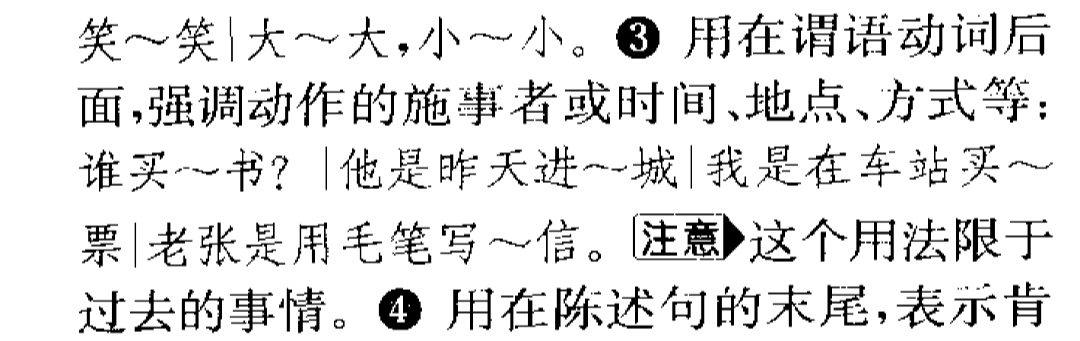 用于某些句子的动词和宾语之间,强调已发生的动作的主语、宾语、时间、地点、方式等。